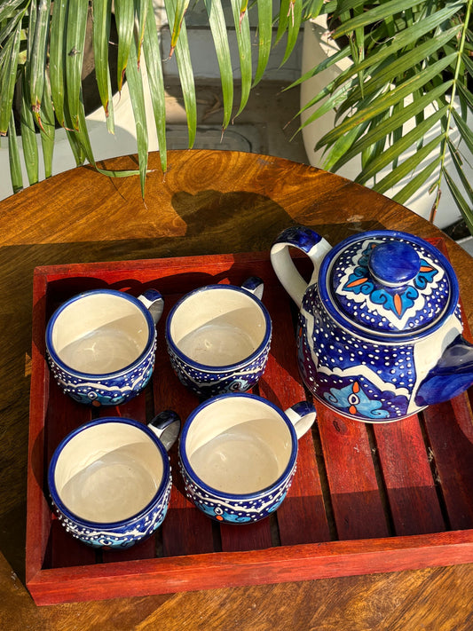 Blue Floral Hand Painted Kettle Set with Wooden Tray (Set of 6)
